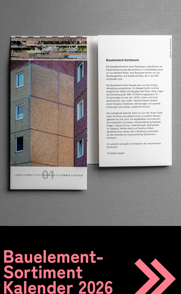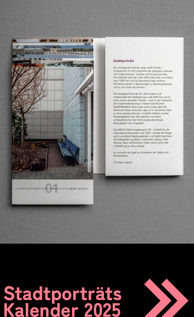 Der weiterführende Kalender von jenawohnen ist mehr als ein klassisches Jahresprodukt. Er ist Teil einer fortlaufenden fotografischen Auseinandersetzung mit der Architektur der DDR und ihren Nachwirkungen im heutigen Stadtraum.