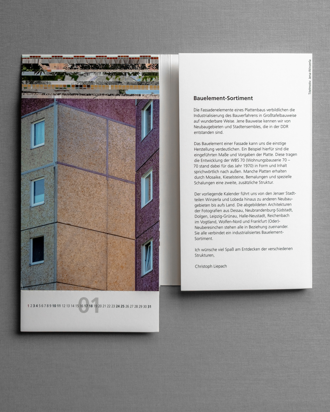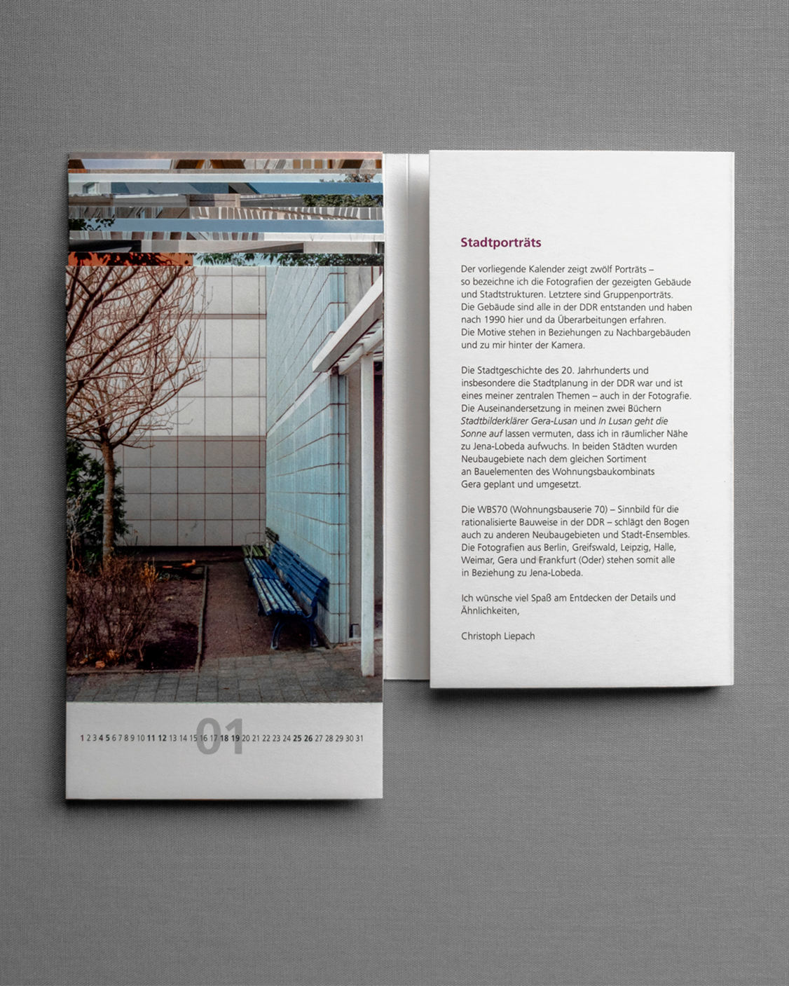 Der weiterführende Kalender von jenawohnen ist mehr als ein klassisches Jahresprodukt. Er ist Teil einer fortlaufenden fotografischen Auseinandersetzung mit der Architektur der DDR und ihren Nachwirkungen im heutigen Stadtraum.